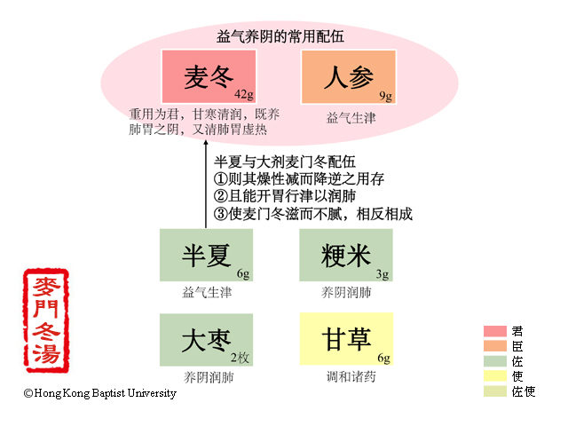 方中重用七升麦门冬为君,甘寒清润,养阴生津,滋液润燥,兼清虚热,两擅其功。然是证为肺胃阴亏之燥证,但亦有肺胃之气上逆之候,遂臣以一升温燥之半夏降逆下气、化痰和胃,一则降逆以止咳、呕,二则开胃行津以助润肺,三则防大剂量麦冬之滋腻壅滞,麦冬得半夏滋而不腻,半夏得麦冬燥不伤津,二者相反相成。人参健脾补气,俾脾胃气旺,自能于水谷之中生化津液,上润于肺,亦即“阳生阴长”之意。甘草、粳米、大枣甘润性平,合人参以和中滋液,培土生金,以上俱为佐药。甘草调和药性,兼作使药。诸药相合,甘寒清润之中佐以辛温降逆之品,滋而不腻,温而不燥,培土生津,肺胃并治,使肺胃阴复,逆气得降,中土健运,诸症自愈。