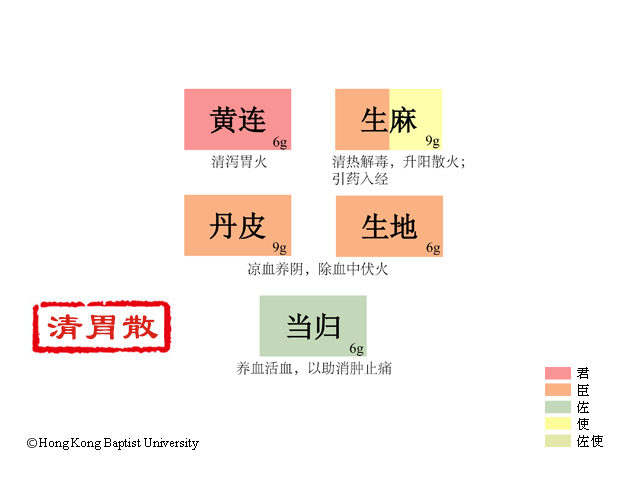 阳明胃多气多血,又两阳合明为热盛,是以邪入而为病常实。若大渴、舌苔、烦躁,此伤气分,热聚胃腑,燥其津液,白虎汤主之。若醇饮肥厚炙煿过用,以致湿热壅于胃腑,逆于经络,而为是病,此伤血分,治宜清胃。方中以生地益阴凉血为君,佐之以丹皮,去蒸而疏其滞;以黄连清热燥湿为臣,佐之以当归,入血而循其经。仍用升麻之辛凉,为本经捷使,引诸药直达血所,则咽喉不清、齿龈肿痛等症,廓然俱清矣。(吴谦《医宗金鉴·删补名医方论》)