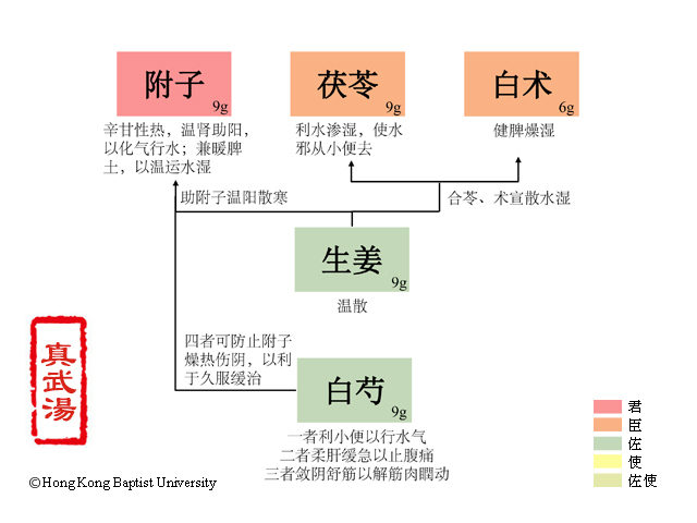 真武一方,为北方行水而设。用三白者,以其燥能治水,淡能伐肾邪而利水,酸能泄肝木以疏水故也。附子辛温大热,必用为佐者何居?盖水之所制者脾,水之所行者肾也。肾为胃关,聚水而从其类。倘肾中无阳,则脾之枢机虽运,而肾之关门不开,水虽欲行,孰为之主?故脾家得附子,则火能生土,而水有所归矣;肾中得附子,则坎阳鼓动,而水有所摄矣。更得芍药之酸,以收肝而敛阴气,阴平阳秘矣。若生姜者,并用以散四肢之水气而和胃也。(罗美《古今名医方论》卷三)