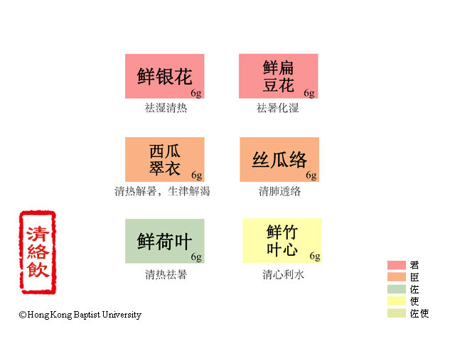 鲜荷叶边二钱 (6g) 鲜银花二钱 (6g) 丝瓜皮二钱 (6g) 西瓜翠衣二钱 (6g) 鲜扁豆花一枝 (6g) 鲜竹叶心二钱 (6g)