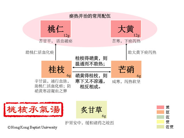本方由调胃承气汤减芒硝之量,加桃仁、桂枝而成。方中大黄苦寒,下瘀泻热;芒硝咸苦寒,泻热软坚,助大黄下瘀泻热;桃仁苦甘平,活血破瘀;桂枝辛甘温,通行血脉,既助桃仁活血祛瘀,又防硝黄寒凉凝血之弊,四者合用,瘀热并治。大黄与桃仁为破血下瘀法之代表配伍,荡涤瘀热从下而走,泻热逐瘀通便以破蓄血。桂枝与硝、黄同用,相反相成,桂枝得硝、黄则温通而不助热;硝、黄得桂枝则寒下而不凉遏。炙甘草护胃安中,并缓诸药之峻烈。诸药合用,活血攻下,相辅相成;寒中寓温,以防凉遏,共奏破血下瘀之功。