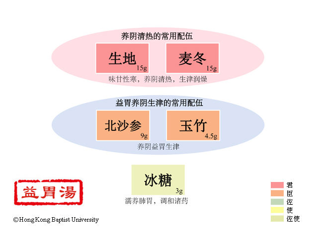 胃阴不足,阴虚生热,故方中重用细生地、麦冬,味甘性寒,养阴清热,生津润燥,为甘凉益胃之上品,共为君药。配伍北沙参、玉竹为臣,养阴生津,助生地、麦冬益胃养阴之力。冰糖濡养肺胃,调和诸药,为佐使药。全方甘凉清润,重在益胃,清而不寒,润而不腻,共奏养阴益胃之效。