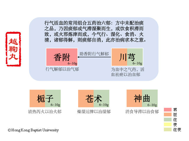 此手足太阴、手少阳药也。吴鹤皋曰:越鞠者,发越鞠郁之谓也。香附开气郁,苍术燥湿郁,抚芎调血郁,栀子解火郁,神曲消食郁。陈来章曰:皆理气也,气畅则郁舒矣。(汪昂《医方集解·理气之剂》)