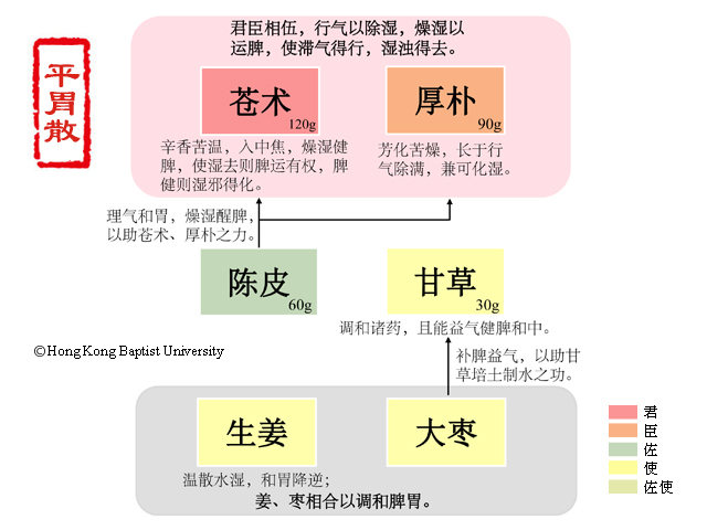 夫土曰稼穑,不及为之卑监,太过则曰敦阜。平胃者,平胃中之敦阜也。然土无成位,湿无专主,皆从化而来,从化而去,随人之脏气使然,阴虚者化为湿热,阳虚者化为寒湿。故治此者,当因其未化而化之,乃无后患。故用苍术辛温燥湿,辟恶强脾,可散可宣者,为化湿之正药。厚朴苦温,除湿而散满;陈皮辛温,理气而行痰,以佐苍术之不及。但物不可太过,过刚则折,当如有制之师,能戡祸乱而致太平。故以甘草中州之药,能补能和者,赞辅之,使湿去而土不伤,致于平和也。(张秉成《成方便读》卷三)