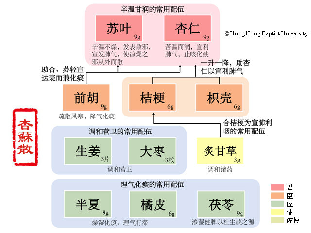 方中苏叶辛温不燥,发汗解表,宣畅肺气,使凉燥之邪从表而解;杏仁苦温而润,肃降肺气,润燥止咳。二药配伍,苦辛温润,共为君药。前胡既助苏叶疏风解表,又助杏仁降气化痰;桔梗、枳壳宣降肺气,既疏理胸膈气机,又化痰止咳祛邪。三药合用,有宣有降,使气顺津布,痰消咳止,共用为臣。橘皮、半夏行气燥湿化痰;茯苓渗湿健脾以杜生痰之源;生姜、大枣调和营卫,滋脾生津以助润燥,共为佐药。甘草调和药性,且合桔梗宣肺利咽,为佐使之用。诸药配伍,外可轻宣凉燥,内可理肺健脾化痰,使表解痰消,肺气和降,诸症可除。