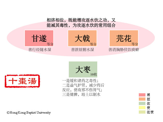 方中甘遂苦寒有毒,善行经隧之水湿;大戟苦寒,善泻脏腑之水邪;芫花辛温,善消胸胁伏饮痰癖。三药峻烈,各有所长,合而用之,峻泻攻逐,可将胸腹积水迅速逐出体外。大枣煎汤送服,取其益脾缓中,防止逐水伤及脾胃,并缓和诸药毒性,使邪去而不伤正,且寓培土制水之意。《医方集解》载:“芫花、大戟性辛苦以逐水饮;甘遂苦寒,能直达水气所结之处,以攻决为用;三药过峻,故用大枣之甘以缓也,益土所以胜水,使邪从二便而出也。”