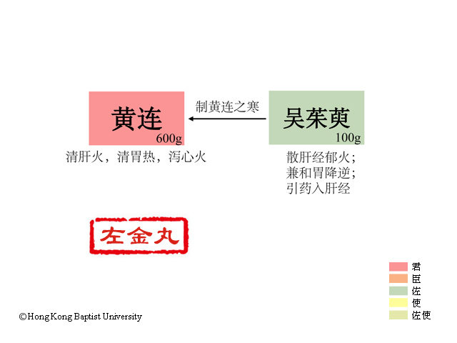 方中黄连用量为吴茱萸之六倍,重用黄连为君,一则与吴茱萸相伍,亦可入肝经而清肝火;二则善清胃热;三则泻心火,寓“实则泻其子”之意。然气郁化火之证,纯用苦寒之品,既恐郁结不开,又虑折伤中阳,故少佐辛热之吴茱萸,主入肝经,辛开肝郁,苦降胃逆,既可助黄连和胃降逆,又能制黄连之寒,使泻火而不凉遏,苦寒而不伤胃,并可引黄连入肝经,是为佐使药。二药配伍,辛开苦降,肝胃同治,寒热并用,主以苦寒,共奏清肝火、降胃逆之效。《医方考》云:“左金者,黄连泻去心火则肺金无畏,得以行金令于左以平肝,故曰左金。”本方又名回令丸,《医方集解》名萸连丸。