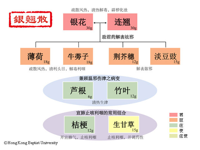 连翘一两 (30g) 金银花一两 (30g) 桔梗六钱 (18g) 薄荷六钱 (18g) 竹叶四钱 (12g) 生甘草五钱 (15g) 荆芥穗四钱 (12g) 淡豆豉五钱 (15g) 牛蒡子六钱 (18g)