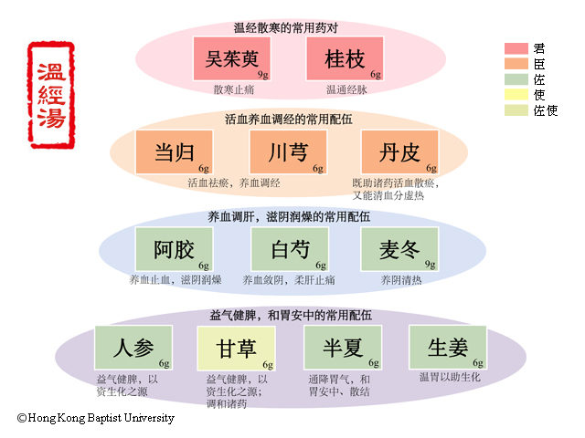 药用温经汤者,其证因半产之虚而积冷气结,血乃瘀而不去。故以归、芍、芎调血,吴萸、桂枝温其血分之气而行其瘀。肺为气主,麦冬、阿胶以补其本。土以统血,参、甘以补其虚,丹皮以去标热。然下利已久,脾气有伤,故以姜、半正脾气。名曰温经汤,治其本也。唯温经,故凡血分虚寒而不调者,皆主之。(徐彬《金匮要略论注》卷二十二)