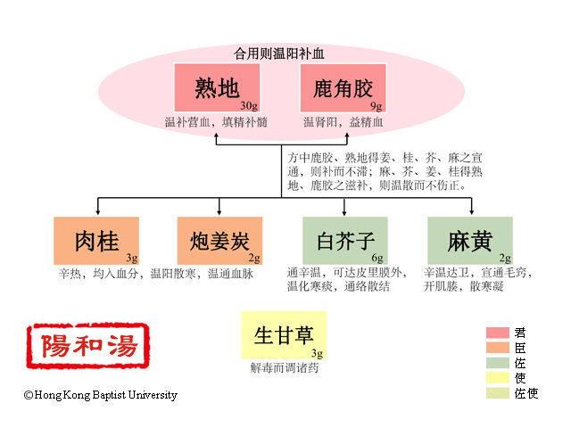 方中重用熟地黄,温补营血,填精益髓;鹿角胶温肾助阳,补益精血。两者合用,温阳补血,以治其本,共为君药。肉桂、姜炭药性辛热,均入血分,温阳散寒,温通血脉,共为臣药。白芥子辛温,可达皮里膜外,温化寒痰,通络散结;少量麻黄,辛温达表,宣通毛窍,开腠理,散寒凝,合为佐药。方中鹿角胶、熟地黄得姜、桂、芥、麻之宣通,则补而不滞;麻、芥、姜、桂得熟地黄、鹿角胶之滋补,则温散而不伤正。生甘草为使,解毒并调诸药。全方配伍,补而不滞,温补营血药与辛散温行药相伍,滋补之中寓温散之法,则宣化寒凝而通经脉,补养精血而扶阳气,用于阴疽,犹如离照当空,阴霾自散,化阴凝而布阳气,使筋骨、肌肉、血脉、皮里膜外凝聚之阴邪,皆得尽去,故名“阳和汤”。