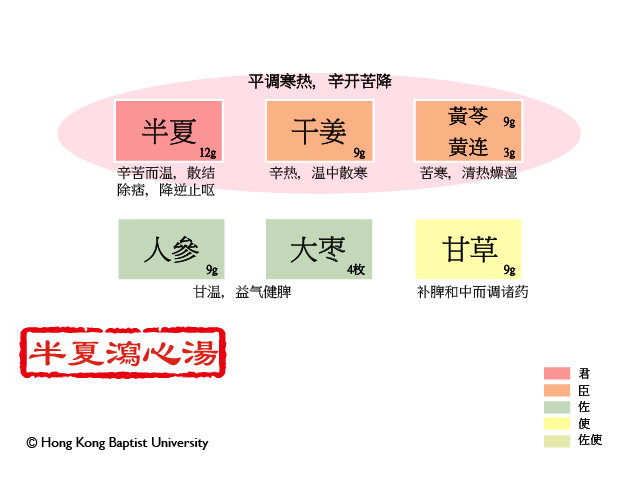 本方为治疗中气虚弱、寒热互结、升降失常之基础方,又是寒热平调、辛开苦降、散结除痞法之代表方。以心下痞满,呕吐泻利,苔腻微黄为辨证要点。
