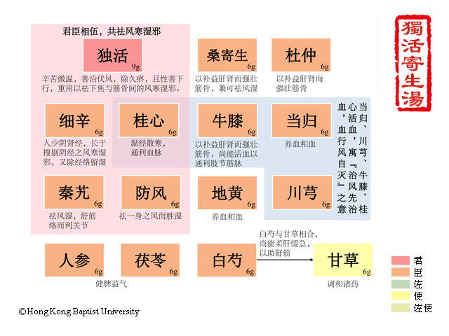 肾气虚弱,肝脾之气袭之,令人腰膝作痛,屈伸不便,冷痹无力者,此方主之。肾,水脏也,虚则肝脾之气凑之,故令腰膝实而作痛;屈伸不便者,筋骨俱病也。《灵枢经》曰:能屈而不能伸者,病在筋;能伸而不能屈者,病在骨。故知屈伸不便,为筋骨俱病也。冷痹者,阴邪实也;无力者,气血虚也。是方也,独活、寄生、细辛、秦艽、防风、桂心,辛温之品也,可以升举肝脾之气,肝脾之气升,则腰膝弗痛矣;当归、熟地、白芍、川芎、杜仲、牛膝者,养阴之品也,可以滋补肝肾之阴,肝肾之阴补,则足得血而能步矣;人参、茯苓、甘草者,益气之品也,可以长养诸脏之阳,诸脏之阳生,则冷痹去而有力矣。(吴崑《医方考》卷五)