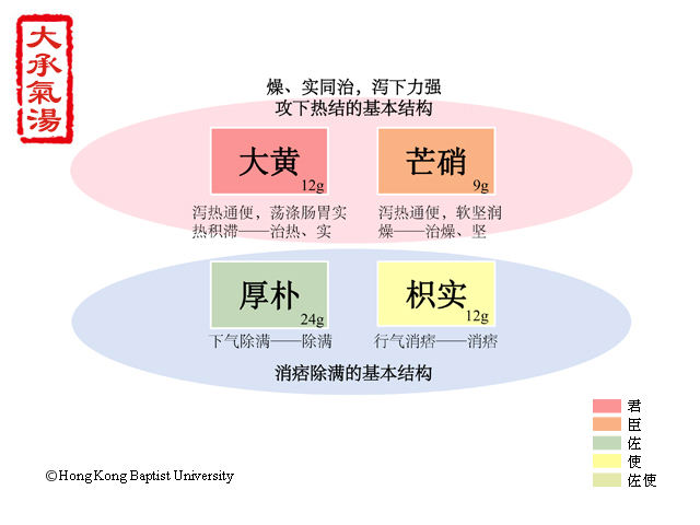 伤寒阳邪入里,痞、满、燥、实、坚全俱者,急以此方主之。调胃承气汤不用枳、朴者,以其不作燥、满,用之恐伤上焦虚无氤氲之元气也。小承气汤不用芒硝者,以其实而未坚,用之恐伤下焦血分之真阴,谓不伐其根也。此则上、中、下三焦皆病,痞、满、燥、实、坚皆全,故主此方以治之。厚朴苦温以去痞,枳实苦寒以泄满,芒硝咸寒以润燥软坚,大黄苦寒以泄实去热。(吴崑《医方考》卷一)