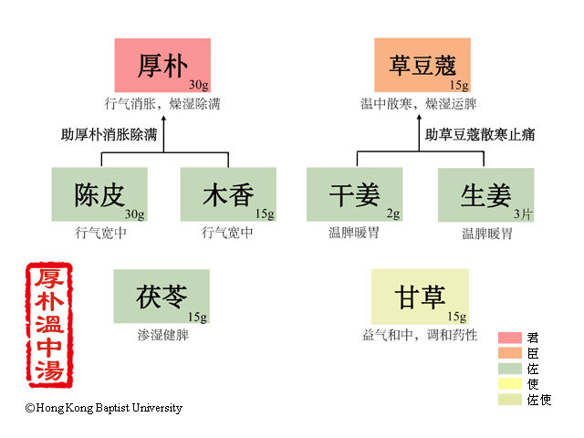 夫寒邪之伤人也,为无形之邪,若无有形之痰、血、食、积互结,则亦不过为痞满、为呕吐,即疼痛亦不致拒按也。故以厚朴温中散满者为君。凡人之气,得寒则凝而行迟,故以木香、草蔻之芳香辛烈,入脾脏以行诸气。脾恶湿,故用干姜、陈皮以燥之,茯苓以渗之。脾欲缓,故以甘草缓之。加生姜者,取其温中散逆,除呕也。以上诸药,皆入脾胃,不特可以温中,且能散表,用之贵得其宜耳。(张秉成《成方便读》卷二)