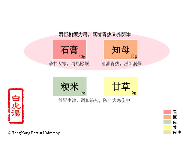 石膏大寒,寒能胜热,味甘归脾,质刚而主降,备中土生金之体,色白通肺,质重而含脂,具金能生水之用,故以为君。知母气寒主降,苦以泄肺火,辛以润肺燥,内肥白而外皮毛,肺金之象,生水之源也,故以为臣。甘草皮赤中黄,能土中泻火,为中宫舟楫,寒药得之缓其寒,用此为佐,沉降之性,亦得留连于脾胃之间矣。粳米稼穑作甘,气味温和,禀容平之德,为后天养命之资,得此为佐,阴寒之物,庶无伤损脾胃之虑也。煮汤入胃,输脾归肺,水精四布,大烦大渴可除矣。白虎为西方金神,用以名汤者,秋金得令,而炎暑自解,此四时之序也。(柯琴《伤寒来苏集·伤寒论注》)