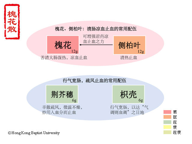 槐花炒 (12g) 柏叶杵,焙 (12g) 荆芥穗 (6g) 枳壳麸炒 (6g) 各等分
