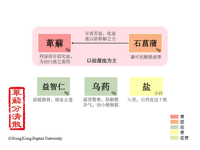 方中萆薢味苦性平,可利湿祛浊,为治疗白浊、膏淋之要药,故为君药。益智仁温补肾阳,涩精缩尿,为臣药。石菖蒲辛香苦温,化浊祛湿,兼祛膀胱之寒,以助萆薢分清化浊;乌药温肾散寒,行气止痛,能除膀胱冷气,治小便频数,为佐药。加盐同煎,则取其咸以入肾,引药直达下焦,为使药。诸药合用,利温相合,通中寓涩,药简效专,共奏温肾祛湿、分清化浊之功。