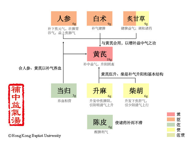 夫脾胃虚者,因饮食劳倦,心火亢盛,而乘其土位,其次肺气受邪,须用黄芪最多,人参、甘草次之。脾胃一虚,肺气先绝,故用黄芪以益皮毛而闭腠理,不令自汗,损其元气;上喘气短,人参以补之;心火乘脾,须炙甘草之甘以泻火热,而补脾胃中元气······白术苦甘温,除胃中热,利腰脐间血。胃中清气在下,必加升麻、柴胡以引之,引黄芪、人参、甘草甘温之气味上升,能补卫气之散解,而实其表也,又缓带脉之缩急,二味苦平,味之薄者,阴中之阳,引清气上升也;气乱于胸中,为清浊相干,用去白陈皮以理之,又能助阳气上升,以散滞气,助诸甘辛为用。(李东垣《内外伤辨惑论》卷中)