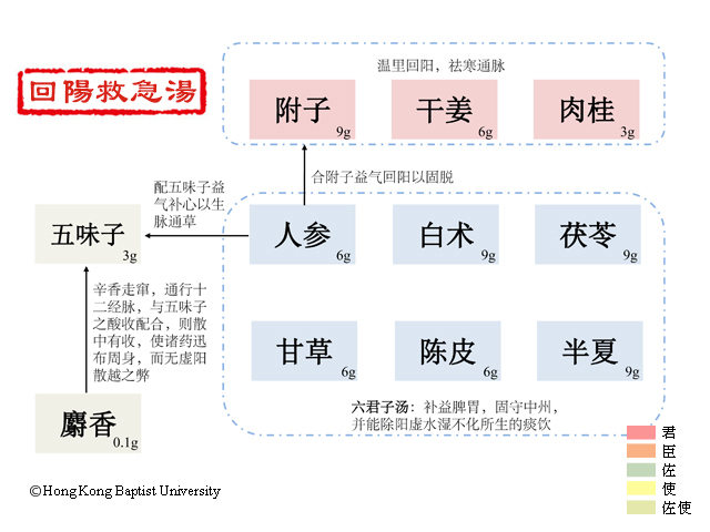 本方以四逆汤合六君子汤,再加肉桂、五味子、麝香、生姜组成。方用附子、干姜、炙甘草之四逆汤,回阳救逆;将生附子易熟附子,可减其毒性。六君子汤(人参、白术、茯苓、炙甘草、半夏、陈皮)加生姜,以益气补中,固守中州。其中人参甘温,大补元气,与附子相配,回阳救逆,益气固脱;再加辛热之肉桂,助附子温壮元阳,通利血脉;更以辛香之麝香,散寒活血开窍,通行十二经脉,使全方药力速达周身。阳气衰微犹恐其辛香而暴亡,故加酸收之五味子,收敛元气,配人参尤能益气生脉。方中麝香与六君子、五味子配伍,宣通与补敛相合,既使药力迅速奏效,又无耗散元气之虞。诸药相合,辛热甘温相配,回阳补中兼顾,辛香酸涩相伍,以防阳气散越,共奏回阳救急、益气固脱之功。