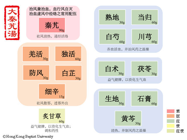 此六经中风轻者之通剂也。以秦艽为君者,祛一身之风也;以石膏为臣者,散胸中之火也;羌活散太阳之风,白芷散阳明之风,川芎散厥阴之风,细辛、独活散少阴之风,防风为风药卒徒,随所引而无所不至者也。大抵内伤必因外感而发,诸药虽云搜风,亦兼发表,风药多燥,表药多散,故疏风必先养血,而解表亦必固里,当归养血,生地滋血,芎劳活血,芍药敛阴和血,血活则风散而舌本柔矣;又气能生血,故用白术、茯苓、甘草补气以壮中枢,脾运湿除,则手足健矣。又风能生热,故用黄芩清上,石膏泻中,生地凉下,以共平逆上之火也。(汪昂《医方集解·祛风之剂》)