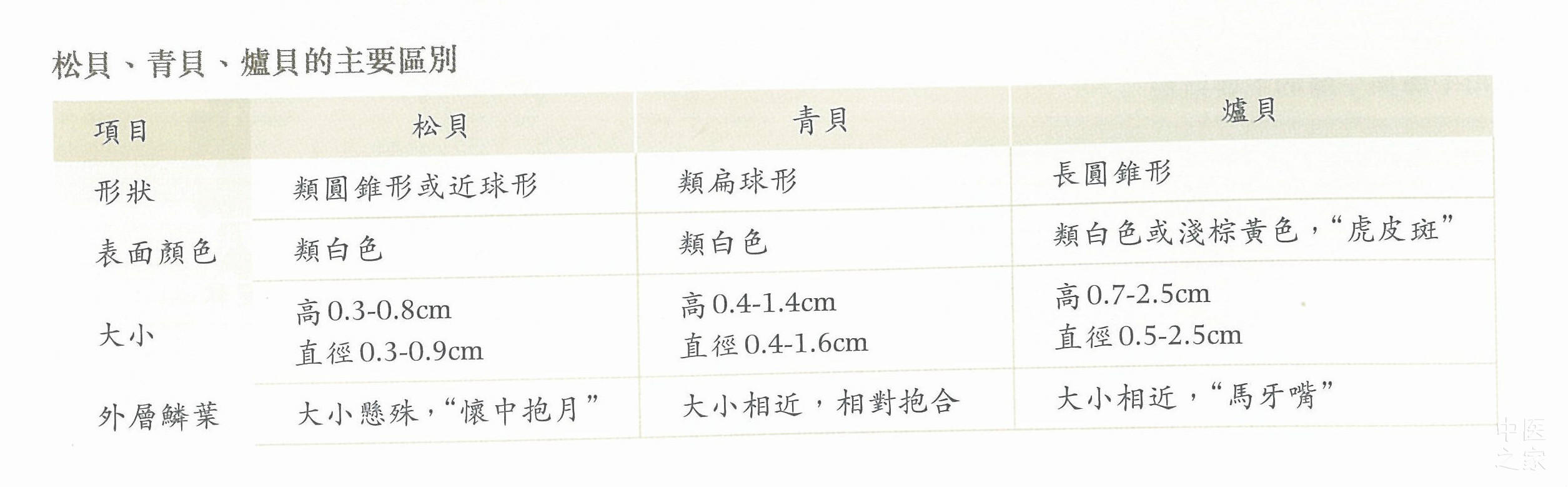 微寒。苦泻心火,辛散肺郁。入肺经气分,心火降则肺气宁。《诗》曰:言采其虻。即贝母也,取其解郁。润心肺,清虚痰。治虚劳烦热,咳嗽上气,吐血咯血,肺痿肺痈,喉痹,君相之火。目眩,火热上攻。淋沥,小肠邪热。心与小肠相表里,肺为气化之源。瘿瘤。化痰。乳闭产难。功专散结除热,敷恶疮,唐时有人膊上生疮如人面,能饮酒食物,亦无他苦,遍投诸药悉受之,至贝母,疮乃颦眉,灌之数日,成痂而愈。敛疮口。火降邪散,疮口自敛,非贝母性收敛也。俗以半夏燥毒,代以贝母,不知贝母寒润,主肺家燥痰;半夏温燥,主脾家湿痰,脱或误用,贴误匪浅。故凡风寒湿食诸痰,贝母非所宜也,宜用半夏、南星。厚朴、白薇为使。畏秦艽,反乌头。