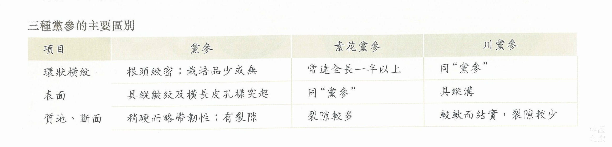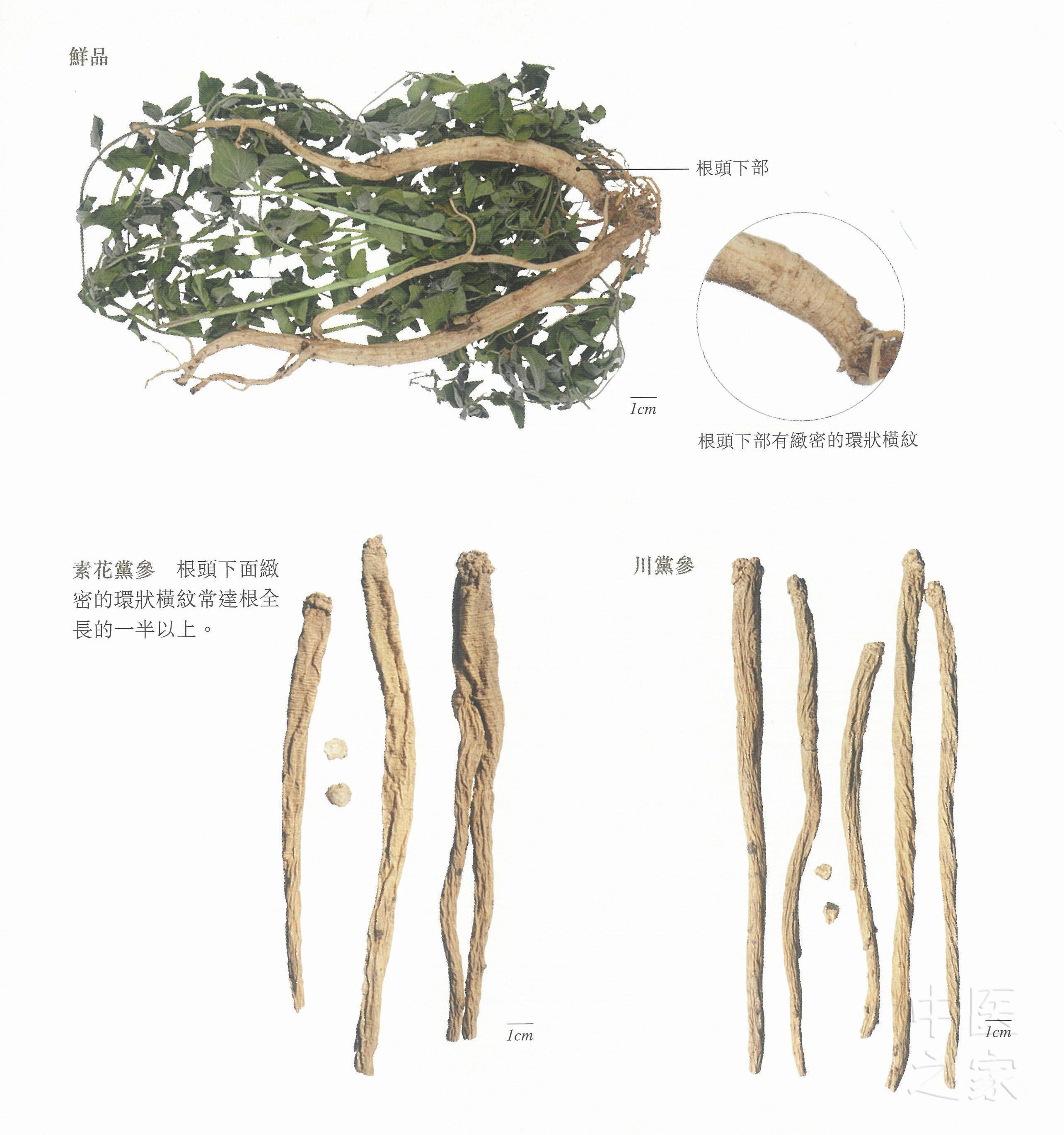 人参而有上党之号,专入肺。盖缘隋文帝时,上党有人宅后,每夜闻人呼,求之不得,去宅一里许,见参异常,掘得人参,一如人体,四肢毕备,呼声遂绝。又上党人参,根颇纤长,根下垂有及一尺余者,或十岐者,其价与银相等,辽东高丽、百济诸参,均莫及焉。李时珍云:上党潞州也。民以人参为地方害,不复采取,今所用者,皆是辽参。观此则知诸参惟上党为最美,而上党既不可采,岂复别有党参之谓哉。近因辽参价贵,而世好奇居异,乃以山西太行山出之苗,及以防风、桔梗、荠苨伪造,相继混行[批]防风党、桔梗党、荠苨党。讵知参有不同,性有各异。防风、桔梗及属表散风寒伤气之味;人参甘温乃属补肺益气之味,即山西太行山新出之党考之,张璐亦谓甘平清肺,并非等于真正党参确有补益。今人但见参贵,而即以此代参,不亦大相径庭乎。且余常见虚弱之症,亟当人参峻补,以救垂绝,而医猥用党参替代,以致病卒不起。并令豪贵之家朝夕代茶,以致肺受剥削,病潜滋长,此皆误用之害,人但习而不察耳。附记以为世之粗工妄用党参戒。