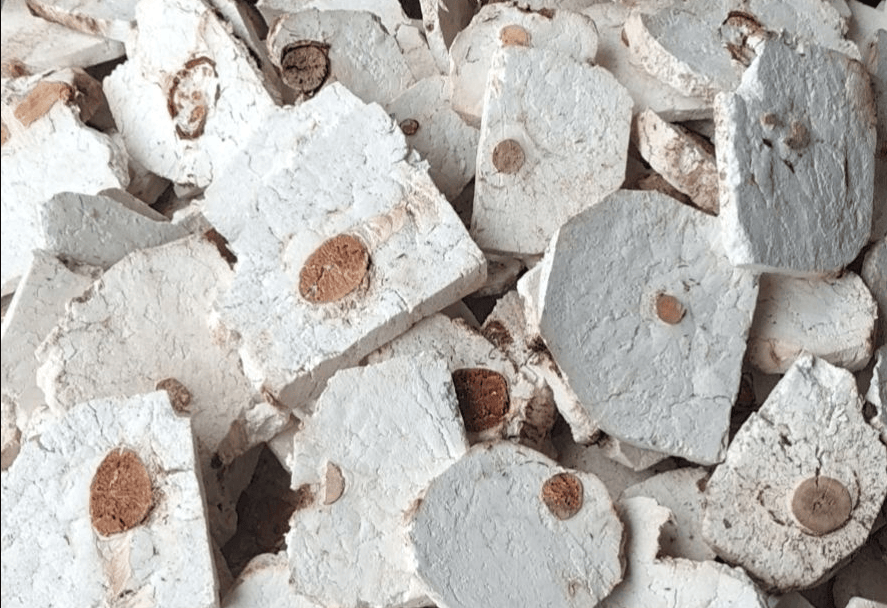 朱茯神:取茯神块,喷淋清水,稍闷润,加朱砂细粉,撒布均匀,并随时翻动,至茯神外面粘满朱砂为度,然后晾干。(每茯神100斤,用朱砂30两)