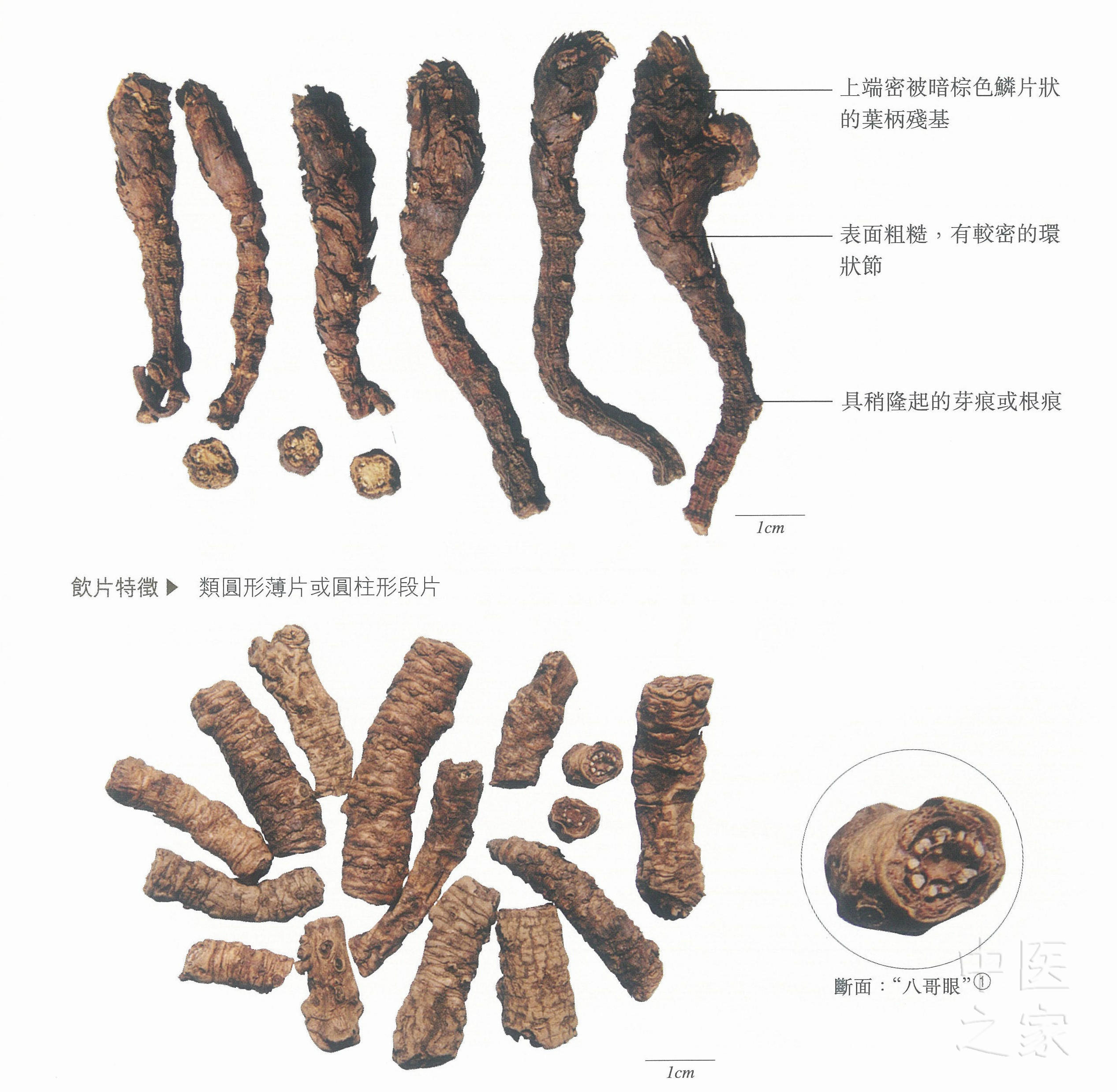 胡黄连,味苦,性寒,无毒,入肝、胆、胃三经。主伤寒咳嗽、温疟发热、骨蒸劳热、三消五痔,补肝胆,明眼目,止泻痢,益颜色,治小儿惊疳霍乱、大人五心烦热、妇人胎蒸虚惊、恶菊花、玄参、白鲜皮,忌猪肉,解巴豆毒。拆之出尘如烟者真。