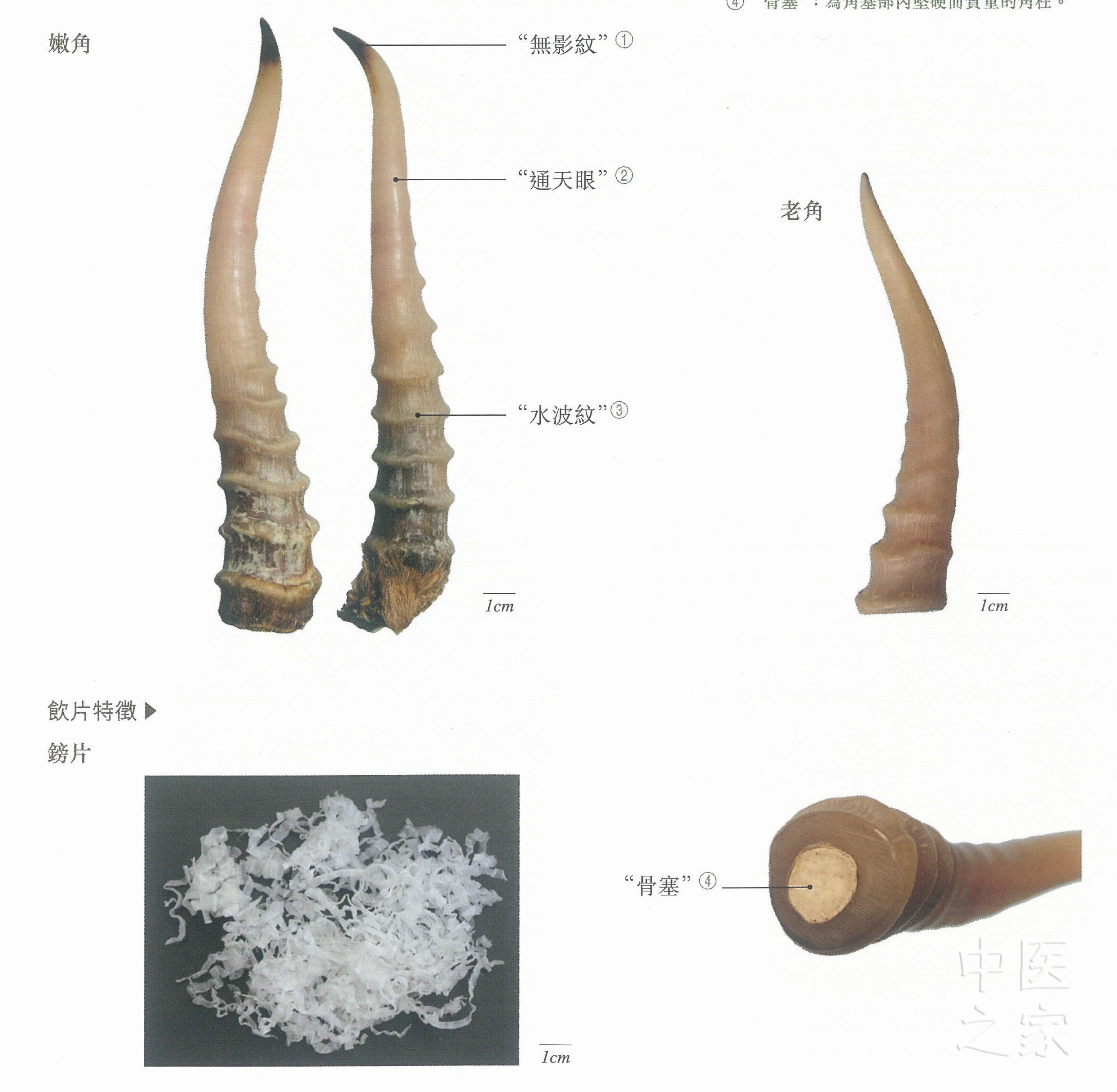 羚羊角,味苦咸,性寒,无毒,入肝经。主伤寒热在肌肤,温风注毒伏在骨间,邪气不祥,惊梦狂越,心神不宁,小儿卒热惊搐,产妇败血冲心,清心解毒,明目益气。烧灰又主食噎不通。其角多节、挂痕深入者为。