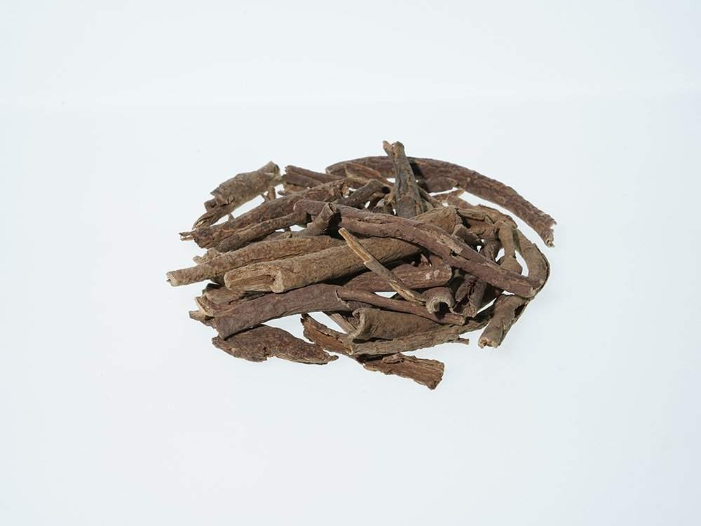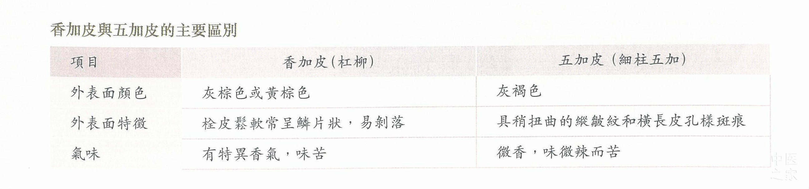 五加皮,味辛苦,性温,无毒,入肺、肾二经。主心腹腰膝痛、疝气、骨节拘挛多年、瘀血在皮肤、阴痿囊湿,小儿脚软、女子阴痒阴蚀,补劳伤,坚筋骨,益志气,添精髓。远志为使,畏蛇皮、玄参。