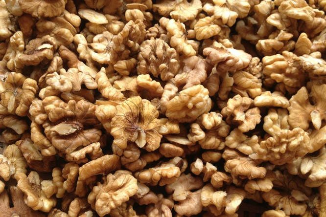 胡桃,味甘,性平,无毒,入肺、肝、肾三经。主通血脉,润肌肤,补下元。同松脂可敷瘰疬;同热酒能理扑伤。去衣用,过食动风生痰。