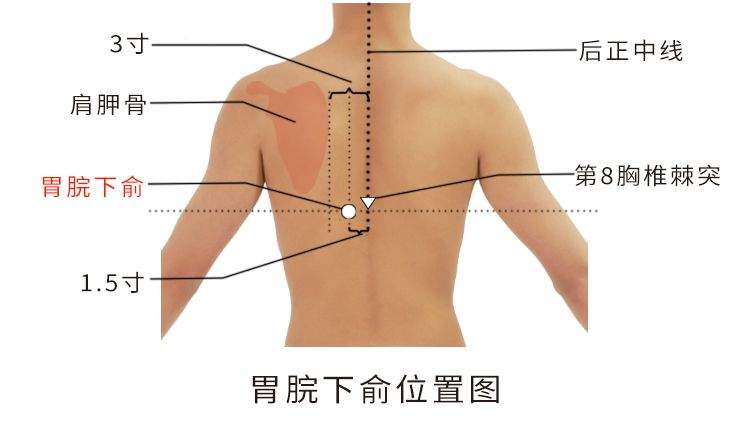 简便定位:在脊柱区,横平第8胸椎棘突下,后正中线旁开1.5寸。
