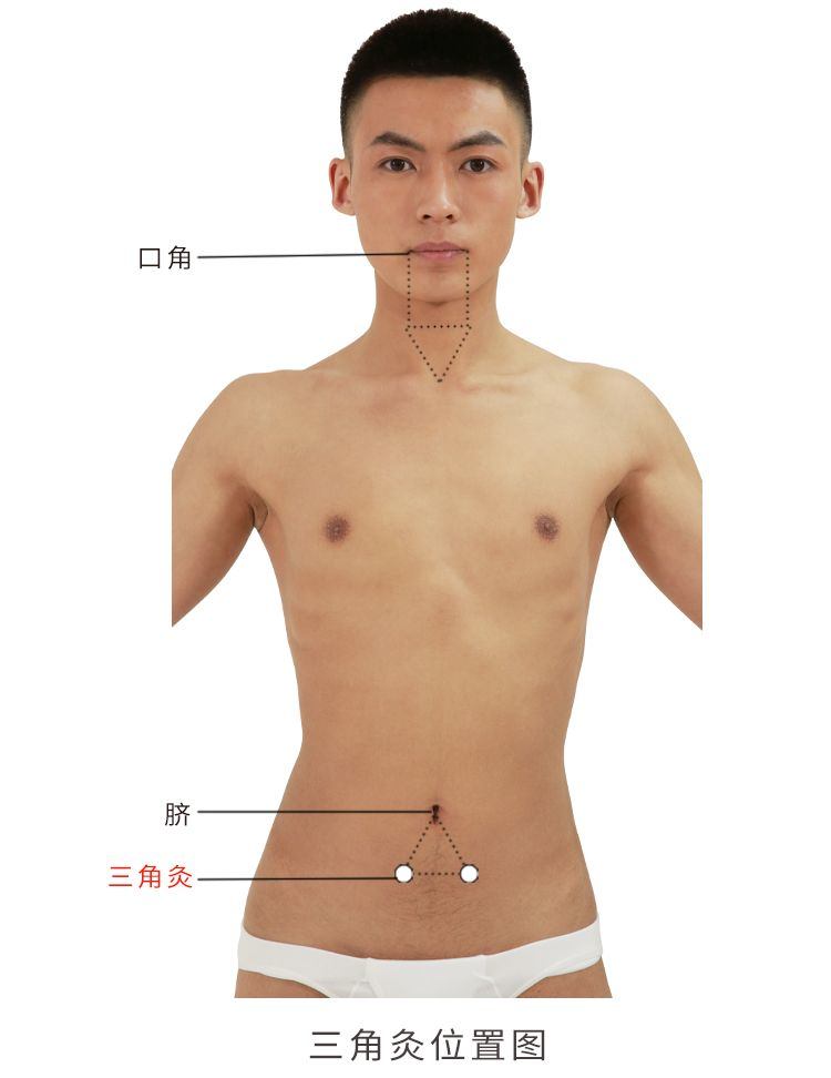 简便定位:在下腹部,以患者两口角之间的长度为一边,做等边三角形,将顶角置于患者脐心,底边呈水平线,两底角处取穴。