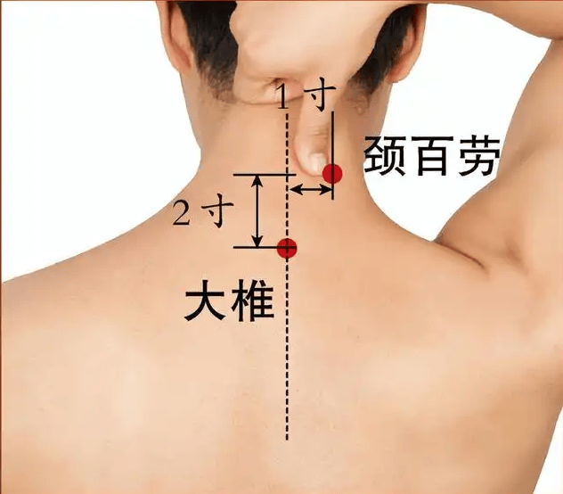 3、《针灸集成》:“百劳,在大椎向发际二寸点记,将其二寸中摺墨记,横布于先点上,左右两端尽处是。主治瘰疬,灸七壮,神效。”