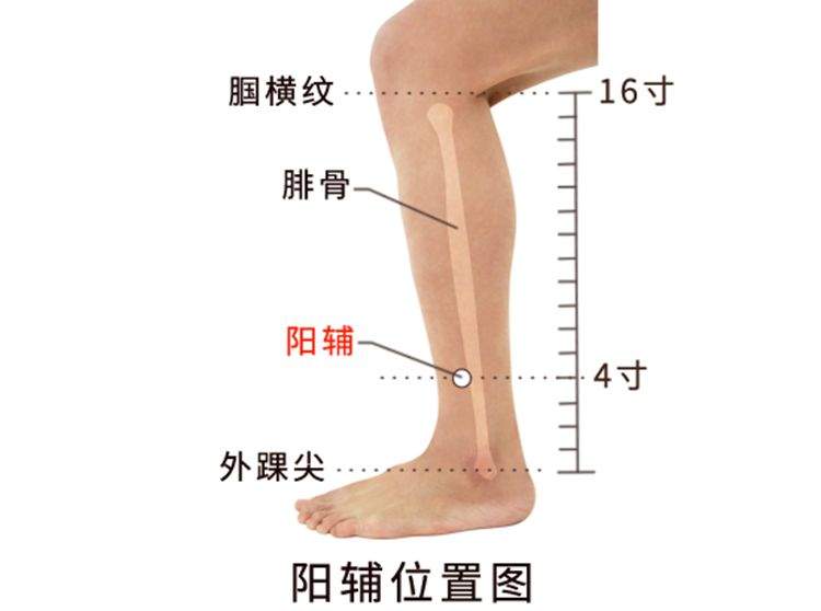 阳辅,经穴名。出自《灵枢·本输》。别名绝骨、分肉。属足少阳胆经。位于小腿外侧,外踝尖上4寸,腓骨前缘。在趾长伸肌和腓骨短肌之间,有胫前动、静脉分支,布有腓浅神经。主治偏头痛、目外眦痛、咽喉肿痛、腋下肿痛、胸胁满痛、瘰疬、下肢痿痹。直刺0.8-1.2寸。