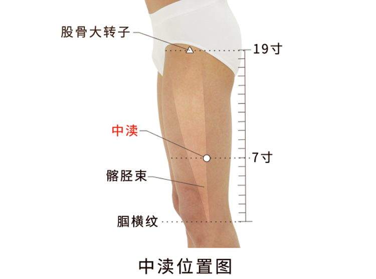 中渎,经穴名。出自《针灸甲乙经》。别名中犊。属足少阳胆经。位于股部,胭横纹上7寸,髂胫束后缘。在阔筋膜下,股外侧肌中,有旋股外侧动、静脉肌支,布有股外侧皮神经,股神经肌支。主治下肢痿痹、麻木及半身不遂等下肢疾患。直刺1-1.5寸。