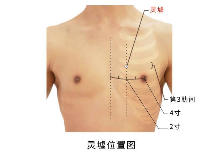 灵墟,经穴名。出自《针灸甲乙经》。属足少阴肾经。位于胸部,第3肋间隙,前正中线旁开2寸。浅部为乳腺组织(男性乳腺组织不明显),其下为胸大肌,有肋间外韧带及肋间内肌,有第3肋间动、静脉,布有第3肋间神经前皮支,深部为第3肋间神经。主治胸胁支满、咳嗽、气喘、乳痈、呕吐。斜刺或平刺0.5-0.8寸。