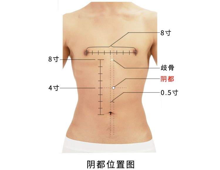 阴都,经穴名。出自《针灸甲乙经》。别名食宫、食吕、石宫、通关。属足少阴肾经。位于上腹部,脐中上4寸,前正中线旁开0.5寸。在腹直肌内缘,有腹壁上动、静脉分支,布有第8肋间神经。主治胃痛、腹胀、便秘等。直刺1-1.5寸。