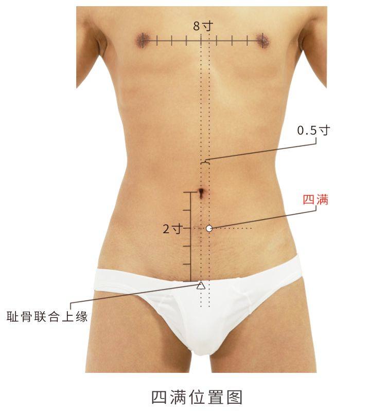 四满,经穴名。出自《针灸甲乙经》。别名髓府、髓中。属足少阴肾经。位于下腹部,脐中下2寸,前正中线旁开0.5寸。肌肉、血管同大赫,布有第11肋间神经。主治月经不调、崩漏、带下、产后恶露不尽、遗精、遗尿、小腹痛、脐下积、聚、疝、瘕、便秘、水肿。直刺1-1.5寸。