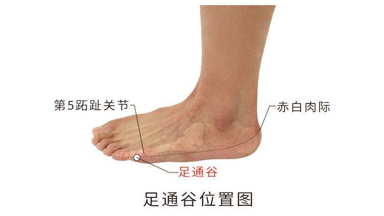 简便定位:足通谷穴位于足趾,第5跖趾关节的远端,赤白肉际处。