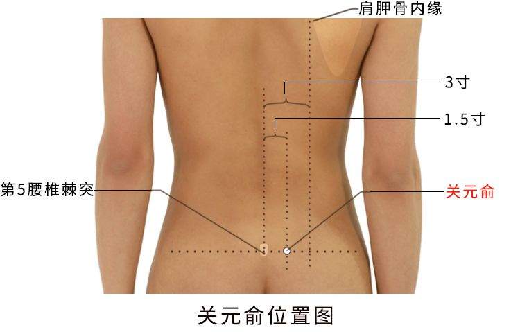 关元俞,经穴名。出自《太平圣惠方》。属足太阳膀胱经。位于脊柱区,第5腰椎棘突下,后正中线旁开1.5寸。有骶棘肌,有腰最下动、静脉后支的内侧支,布有第5腰神经后支。主治腹胀、泄泻、腰骶痛、小便频数或不利、遗尿。直刺0.8-1.2寸。