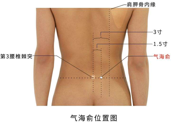 气海俞,经穴名。出自《太平圣惠方》。属足太阳膀胱经。位于脊柱区,第3腰椎棘突下,后正中线旁开1.5寸。在腰背筋膜、最长肌和髂肋肌之间,有第3腰动、静脉后支,浅层布有第3、4腰神经后支的皮支,深层为第3、4腰神经后支的肌支。主治肠鸣、腹胀、痛经、腰痛。直刺0.5-1寸。