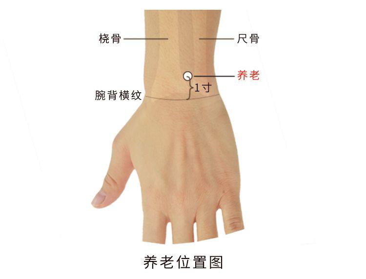 养老,经穴名。出自《针灸甲乙经》。属手太阳小肠经。位于前臂后区,腕背横纹上1寸,尺骨头桡侧凹陷中。在尺骨背面,尺骨茎突上方,尺侧腕伸肌腱和小指固有伸肌腱之间,布有前臂骨间背侧动、静脉的末支,腕静脉网,有前臂背侧皮神经和尺神经。主治目视不明、肩酸痛、背酸痛、肘酸痛、臂酸痛。直刺或斜刺0.5-0.8寸。