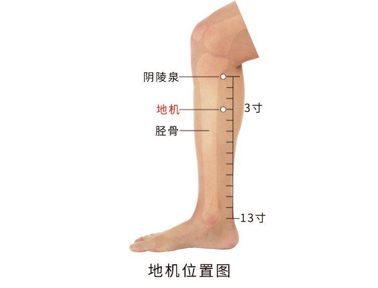 地机,经穴名。出自《针灸甲乙经》。别名脾舍。属足太阴脾经。位于小腿内侧,阴陵泉下3寸,胫骨内侧缘后际。在胫骨后缘和比目鱼肌之间,前方有大隐静脉及膝最上动脉的末支,深层有胫后动、静脉,布有小腿内侧皮神经,深层后方有胫神经。主治痛经、崩漏、月经不调、腹痛、腹泻、疝气、小便不利、水肿等。直刺1-1.5寸。