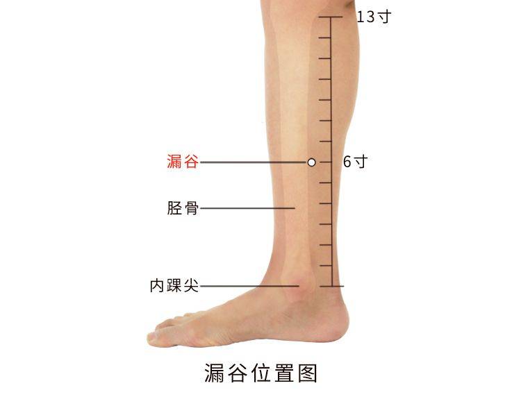 漏谷,经穴名。出自《针灸甲乙经》。别名足太阴络、太阴络。属足太阳脾经。位于小腿内侧,内踝尖上6寸,胫骨内侧缘后际。在胫骨后缘和比目鱼肌之间,深层有趾长屈肌,有大隐静脉,胫后动、静脉,有小腿内侧皮神经,深层内侧后方有胫神经。主治腹胀、肠鸣、小便不利、失精、下肢痿痹。直刺1-1.5寸。