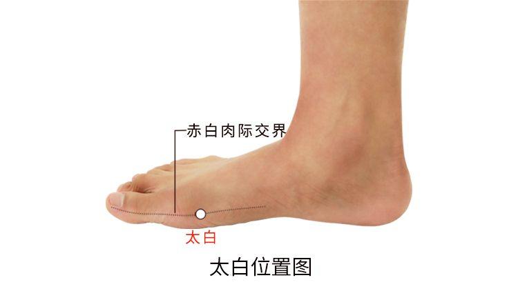 太白,经穴名。出自《灵枢·本输》。属足太阴脾经。位于跖区,第1跖趾关节近端赤白肉际凹陷中。在[母]趾展肌中,有足背静脉网,足底内侧动脉及足跗内侧动脉分支,布有隐神经及腓浅神经分支。主治肠鸣、腹胀、腹泻、胃痛、便秘、体重节痛。直刺0.5-0.8寸。