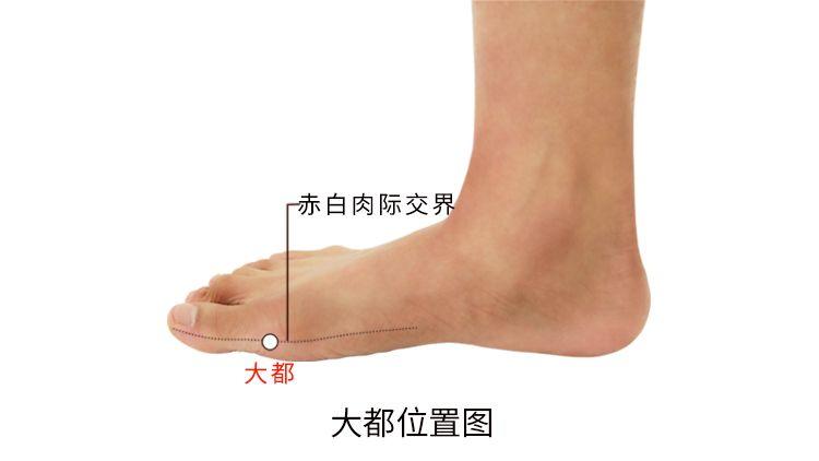 大都,经穴名。出自《灵枢·本输》。属足太阴脾经。位于足趾,第1跖趾关节远端赤白肉际凹陷中。在(足母)趾展肌止点。有足底内侧动、静脉的分支。布有足底内侧神经的趾足底固有神经。主治腹胀、胃痛、呕吐、腹泻、便秘、热病、无汗。直刺0.3-0.5寸。
