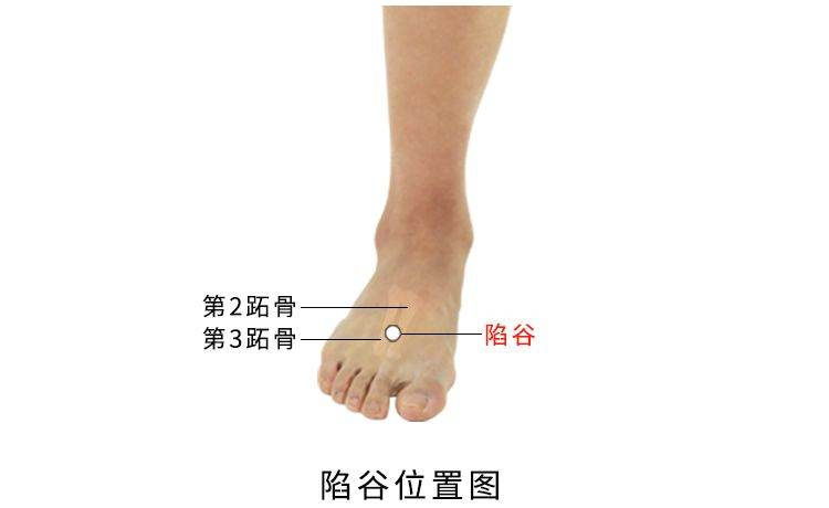 陷谷,经穴名。出自《灵枢·本输》。别名陷骨。属足阳明胃经。位于足背,第2、3跖骨间,第2妬趾关节近端凹陷中。有第2跖骨间肌,有足背静脉网,布有足背内侧皮神经。主治面肿、水肿、足背肿痛、肠鸣、腹痛。直刺或斜刺0.3-0.5寸。