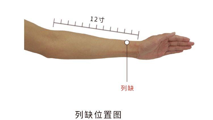 列缺,经穴名。出自《灵枢·经脉》。别名童玄、裂缺。属手太阴肺经。位于前臂,腕掌侧远端横纹上1.5寸,拇短伸肌腱和拇长展肌腱之间,拇长展肌腱沟的凹陷中。在肱桡肌腱、拇长展肌腱与拇短伸肌腱之间,桡侧腕长伸肌腱内侧,有头静脉,桡动、静脉分支,布有前臂外侧皮神经和桡神经浅支的混合支。主治咳嗽、气喘、咽喉肿痛、偏正头痛、齿痛、项强痛、口眼歪斜、手腕痛。向上斜刺0.5-0.8寸。