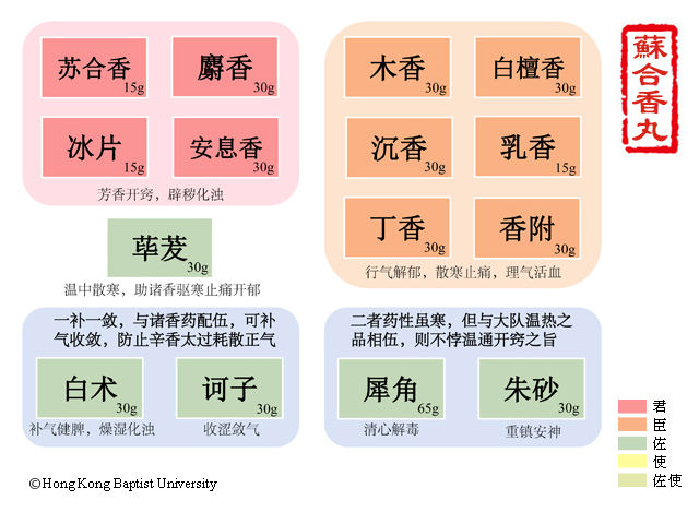 方中苏合香、麝香、龙脑香(冰片)、安息香芳香开窍,启闭醒神,辟秽化浊,共为君药。香附理气解郁;青木香行气止痛;沉香降气温中,温肾纳气;白檀香行气和胃;熏陆香(乳香)调气活血定痛;丁香温中降逆,治心腹冷痛。上述诸药,行气解郁,散寒止痛,理气活血,共为臣药。佐以辛热之荜茇,配合诸香温中散寒止痛;犀角(水牛角代)清心解毒,朱砂镇心安神,二者药性虽寒,但与大队温热之品相伍,则不悖温通开窍之旨;吃力伽(白术)补气健脾,燥湿化浊,诃子温涩敛气,二药一补一敛,防辛散走窜太过,耗气伤正,均为佐药。